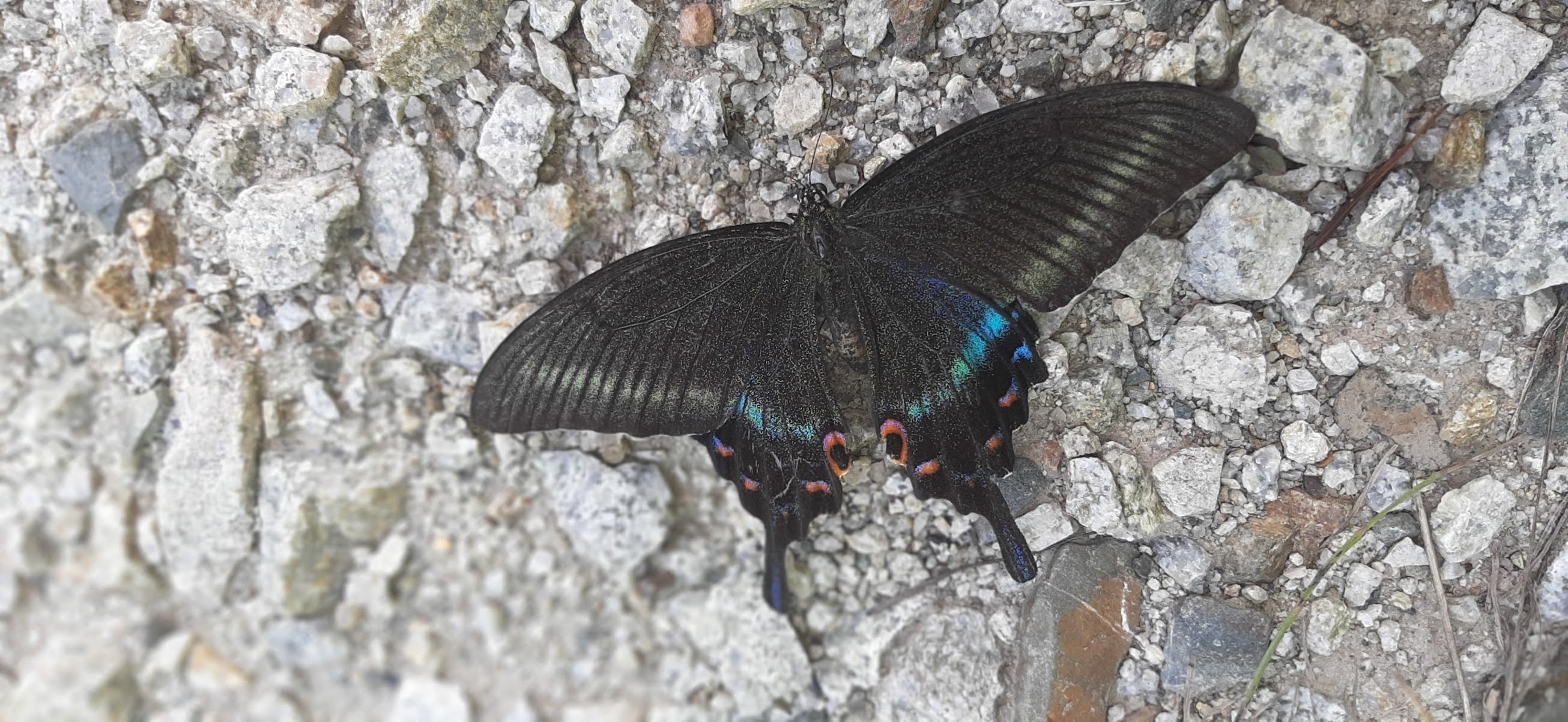 Двигаюсь дальше, снова возвращаюсь на трассу, чтобы добраться до следующей точки - Стеклянный пляж в бухте Десантной. На дороге лежит сбитый хвостоносец Маака - самая большая бабочка России.